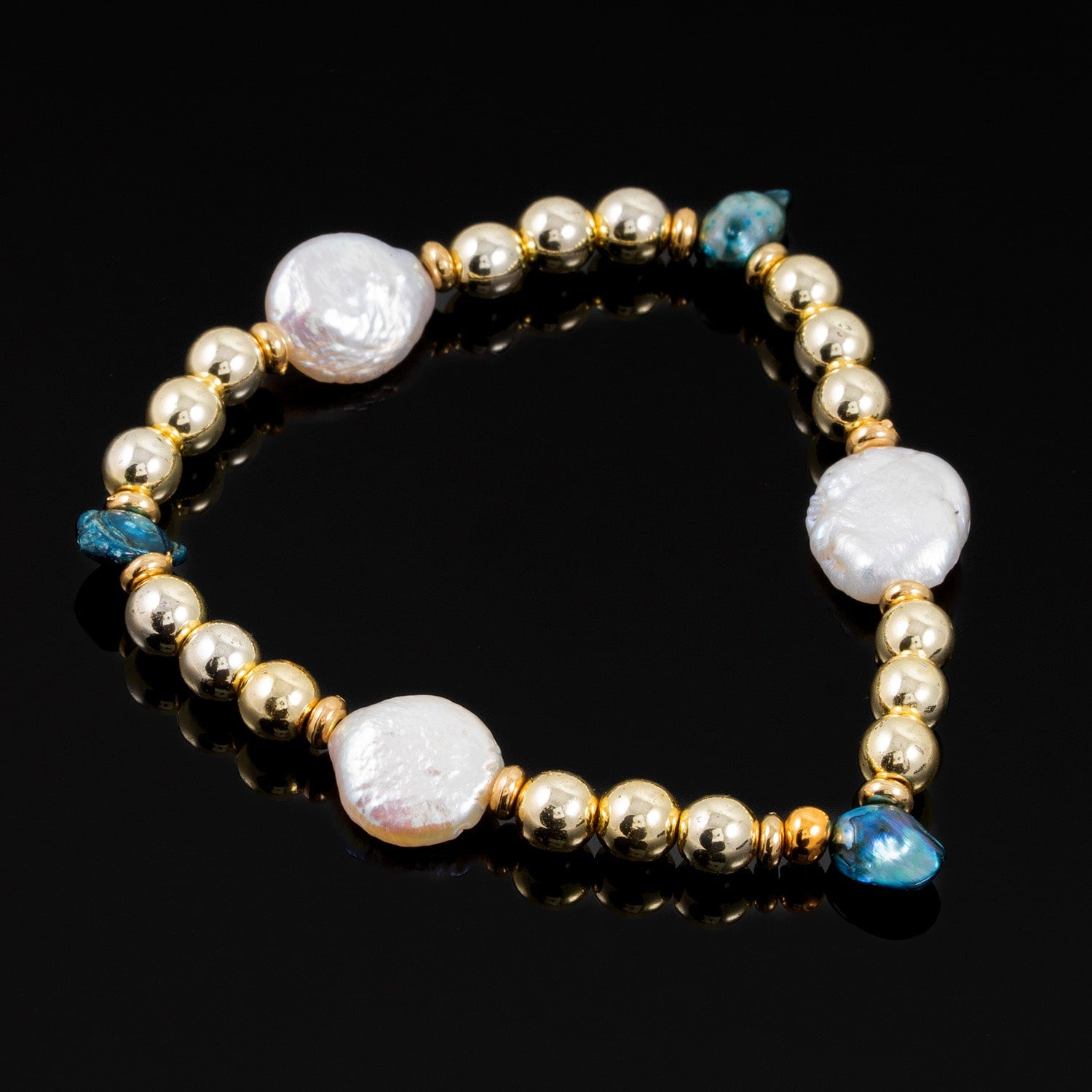 The Cyanora Bracelet weaves together freshwater coin pearls with serene blue freshwater teardrop pearls accented between gold-toned hematite.